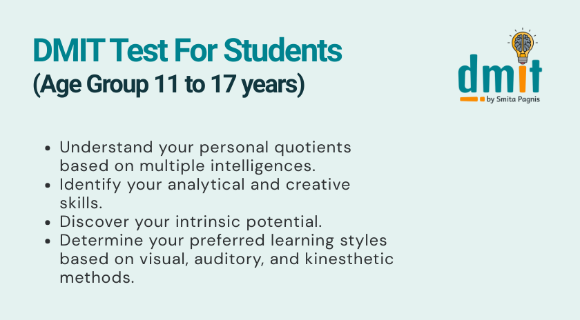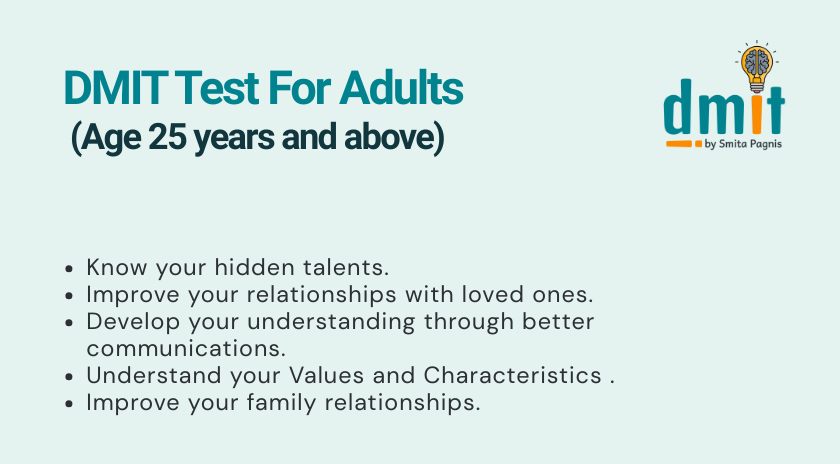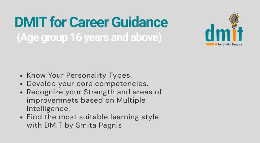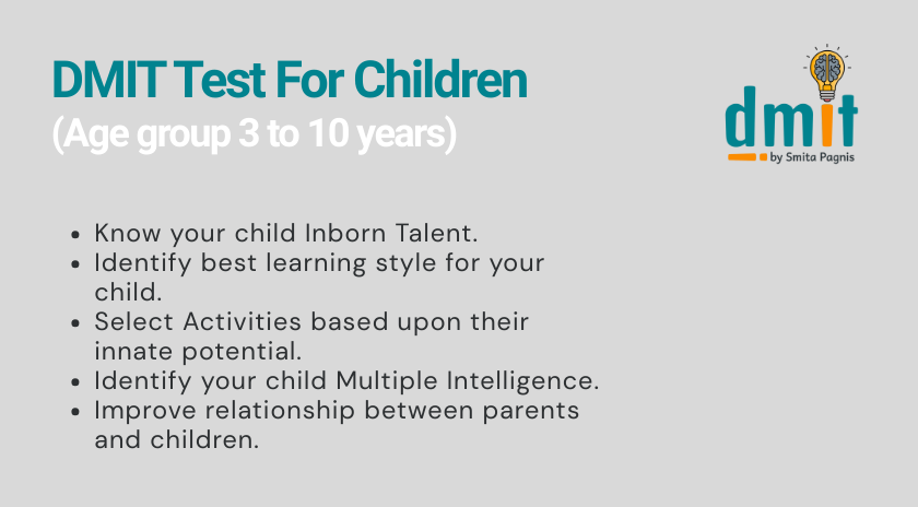 DMIT BY SMITA PAGNIS has initiated this effort to help identify the inborn intelligence level of a child or adult, by exploring a person focus of interest and areas of strength,in turn helping a person to take the right path in order to achieve his or her goals .