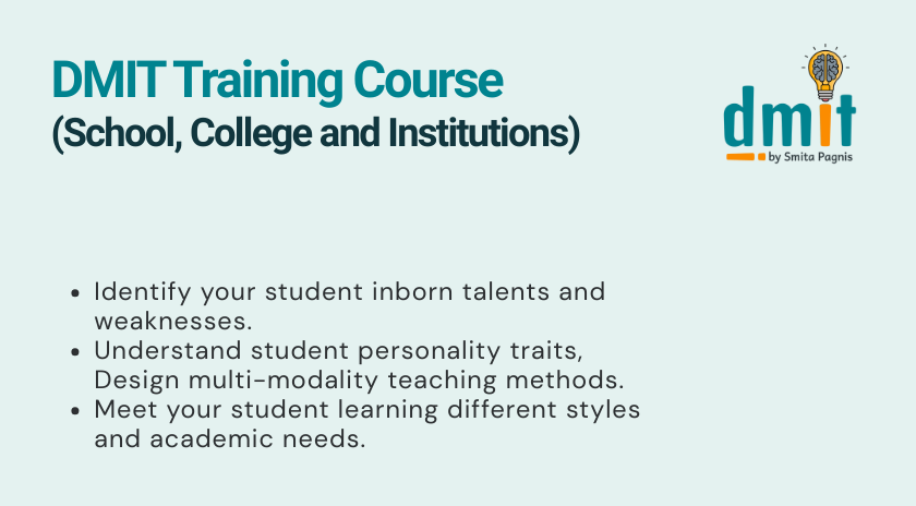 We at DMIT BY SMITA PAGNIS help children to unleash their potential and talent with proven scientific methodology. How to take best use of our Inborn Strengths in Life and how to improve average or weaker areas in life, that’s what we answer at DMIT BY SMITA PAGNIS has taken the Mission to empower everybody believe in human potential more because there is nobody in this world who is not capable of doing more than he thinks he can. Often, people underestimate their capacity of setting & achieving big goals.
